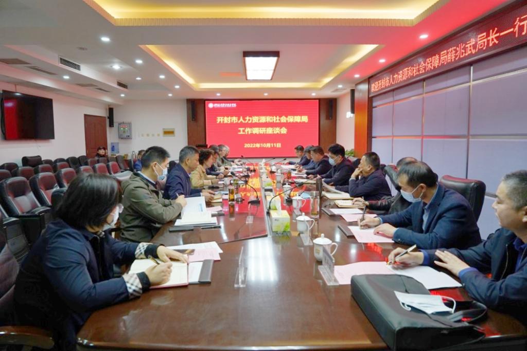 10月11日下午,开封市人力资源和社会保障局党组书记、局长、二级巡视员薛兆武一行到365官网调研指导工作。校党委书记周保平,党委副书记、校长胡昊,副校长菅浩然及有关部门负责人陪同调研并深入座谈交流。调研座谈会由胡昊主持。