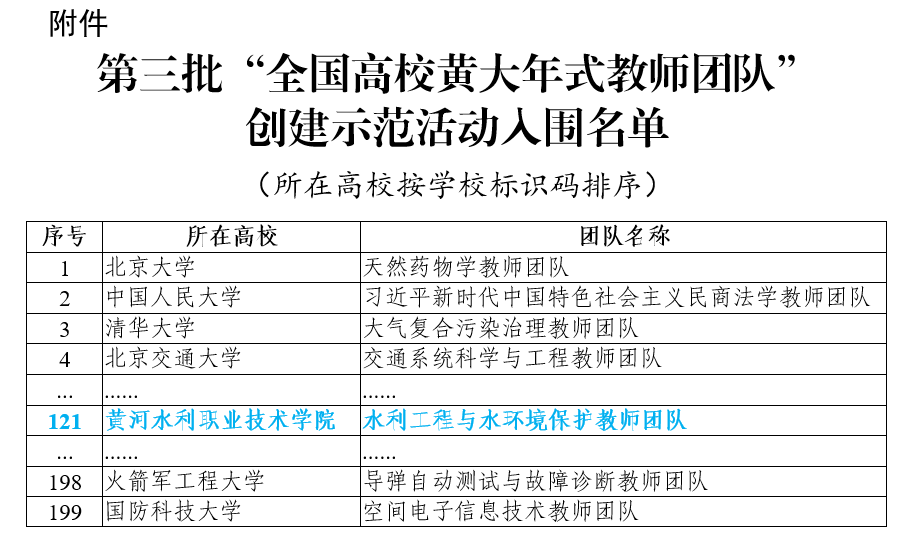 近日,教育部公布了第三批全国高校黄大年式教师团队创建示范活动入围名单的通知,365官网水利工程与水环境保护教师团队成功入选第三批全国高校黄大年式教师团队,全国高职院校仅30所入围。从首批到第三批,365官网共有2支团队获批全国高校黄大年式教师团队。截止目前,拥有2支全国黄大年教师团队的高职院校全国仅有4所,365官网为其中之一,也是河南省高职唯一、水利高职院校唯一。