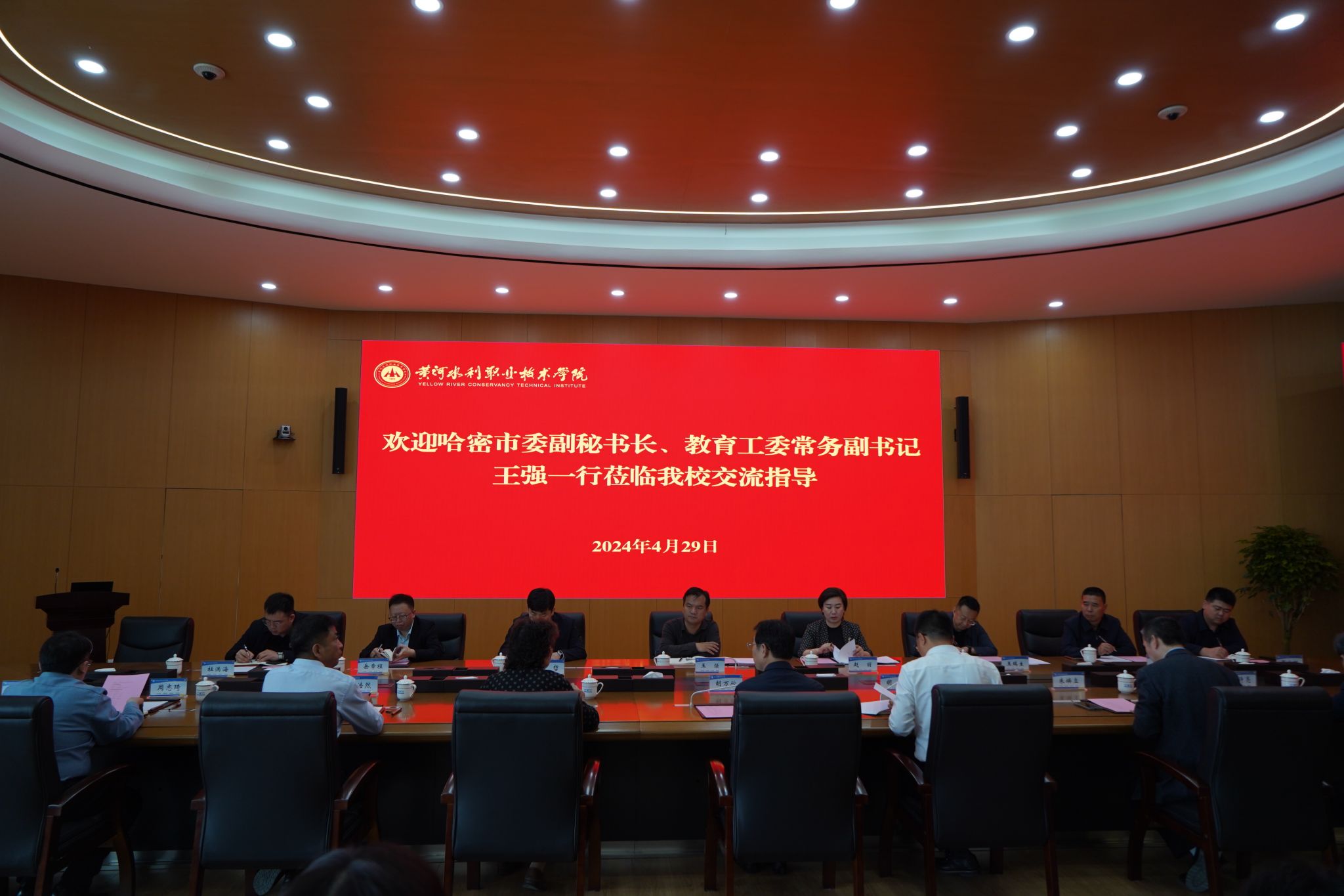 4月29日上午,新疆哈密市委副秘书长、教育工委常务副书记王强,哈密市委教育工委副书记、教育局党组书记、局长赵丽,哈密职业技术学院党委书记王瑞生一行来校调研交流。河南省教育厅二级巡视员胡万欣陪同调研。校党委书记周保平,党委副书记、校长胡昊,副校长菅浩然、朱焕立、周志琦,纪委书记刘许亮,党政办公室、党委组织部、教师工作部、教务处、发展规划处等职能部门负责人参加了调研座谈会。座谈会由胡昊主持。
