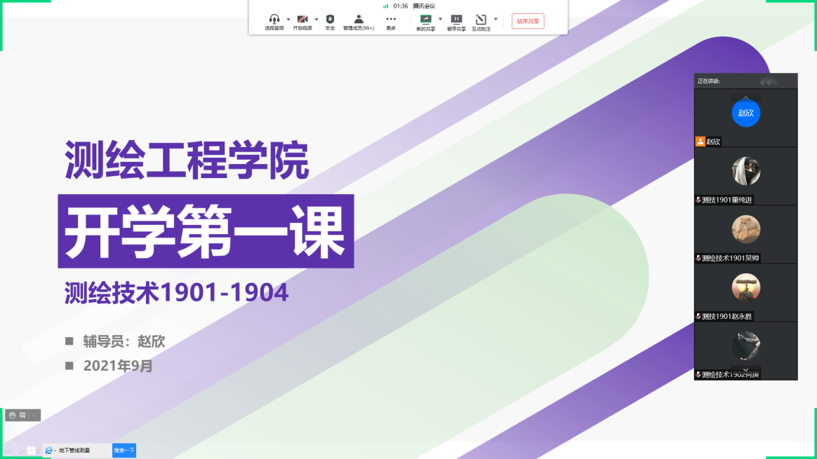 为做好新冠疫情防控下的学生思想政治教育工作,以不负时代、不负韶华的奋进姿态开启2021年秋季学期新征程。9月13日,赵老师为测绘技术1901-1904共计127名学生召开“开学第一课”主题班会。赵老师从疫情防控、抗洪救灾、学风建设、奖助贷政策等方面对学生开展思想政治教育,引导激励传播正能量。