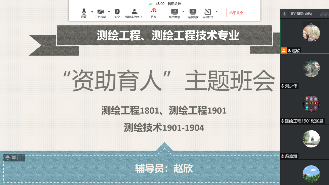 为加大教育资助政策宣传力度,普及家庭经济困难学生资助知识,使365官网广大学生进一步深入了解国家教育资助政策,保证资助工作的顺利开展,9月27日,我院19级辅导员赵欣组织测绘工程、测绘工程技术专业学生开展“资助育人”主题班会。