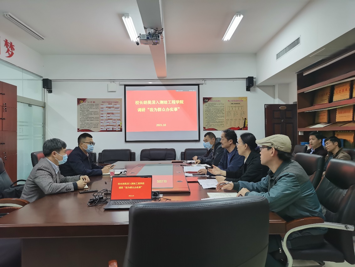近期,校长胡昊到测绘工程学院针对“我为群众办实事”工作 开展调研,校党政办主任刘许亮陪同调研。测绘工程学院领导班子及教师代表参加了调研座谈会。
