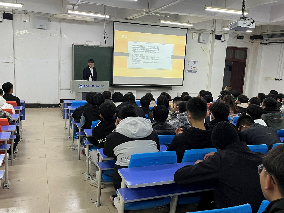 三好学生尤存存就如何处理好学生干部工作和学习之间的关系,讲述了自身的经验,针对如何做好学生干部工作,成为老师和学生之间的有力助手,向同学们提供了有效办法。学习标兵贾士豪为同学们详细讲解了测绘技能大赛的类型、竞赛规则、如何备赛等,为学弟学妹们提供了实用建议;学习标兵王旭向大家讲述了自身经历,在学习方法和自身品格的塑造方面给予了在场观众深刻的启示,激励大家立足自身做好规划;学习标兵张文彪针对如何锁定目标、端正学习动机,展开专业学习的心路历程,分享了自己专业课学习的技巧和感悟;学习标兵康江琛向同学们展示了大学生活中他在学业上取得的成绩,分享了自己的学习经验和实践经验,在平衡学习和课余活动方面也提出了实用的建议。与会同学认真聆听宣讲人带来的奋斗故事、分享的成功经验,并为他们的先进事迹、精彩分享送上热烈的掌声。同时,在宣讲期间,同学们将自己的疑惑和想法踊跃进行提问,5位宣讲人都为其一一解答。