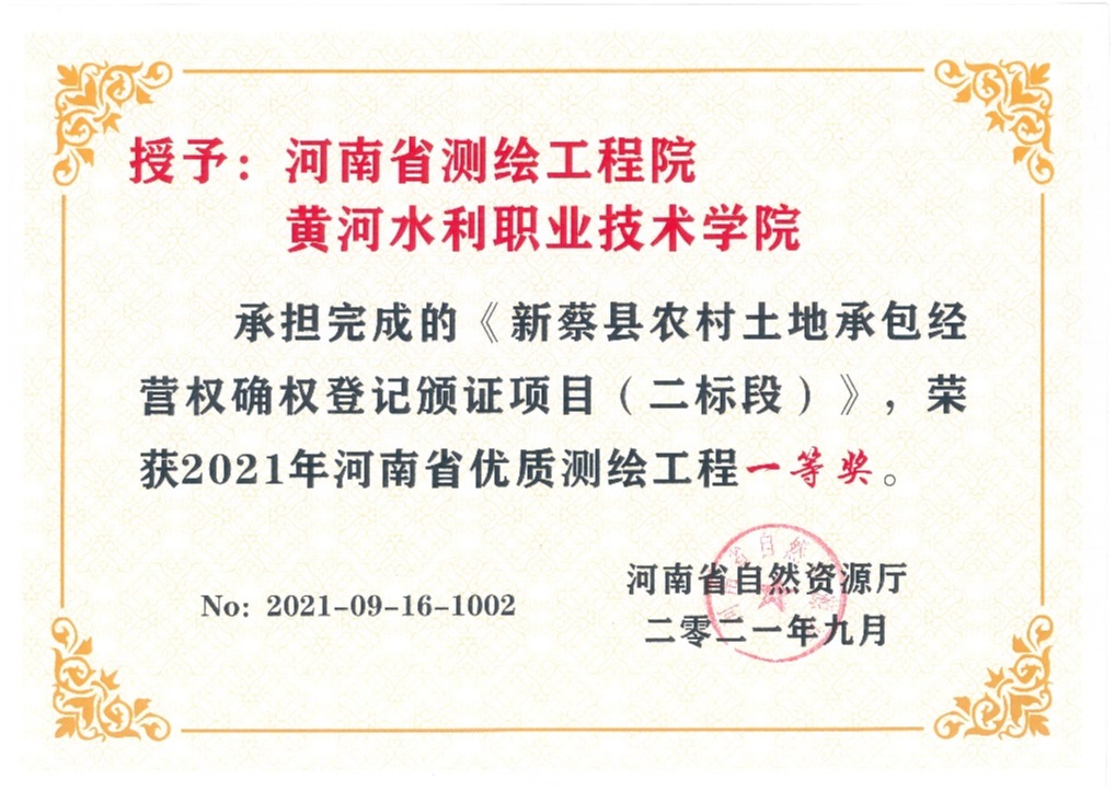 从河南省自然资源厅获悉,我院与河南省测绘工程院联合申报的《数字息县地理空间框架建设项目》和《新蔡县农村承包经营权确权登记颁证项目(二标段)》双双获得2021年河南省优质测绘工程一等奖。