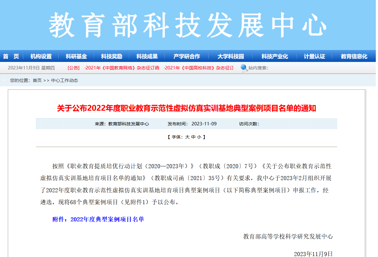 2023年11月9日,教育部高等学校科学研究发展中心公布2022年度职业教育示范性虚拟仿真实训基地典型案例项目名单,全国共68个典型案例项目入选,beat365唯一官网申报的《“校企共建、虚实共融、区域共享、教学共频”,高水平虚拟仿真实训基地助力高质量人才培养》项目成功入选。