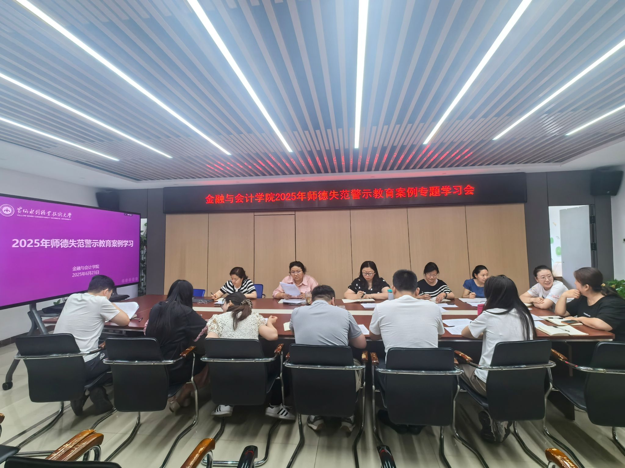 6月25日上午,金融与会计学院在SY5412会议室召开2025年师德师风警示教育案例专题学习会,全体科级干部参加,会议由党总支书记胡晓慧主持。