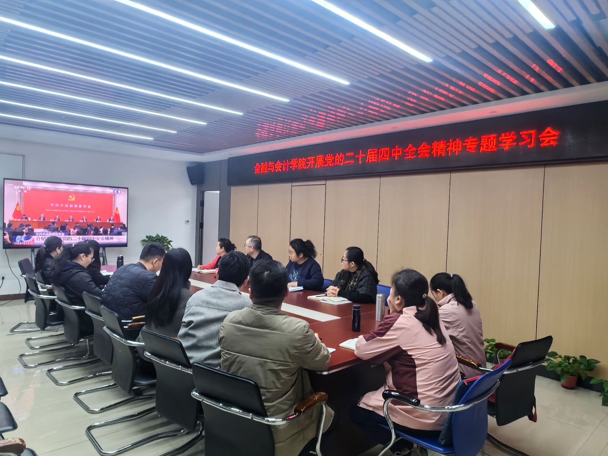 10月28日上午,金融与会计学院在SY5412会议室召开党的二十届四中全会精神专题学习会,全体科级以上干部参加,会议由院长吴宗奎主持。