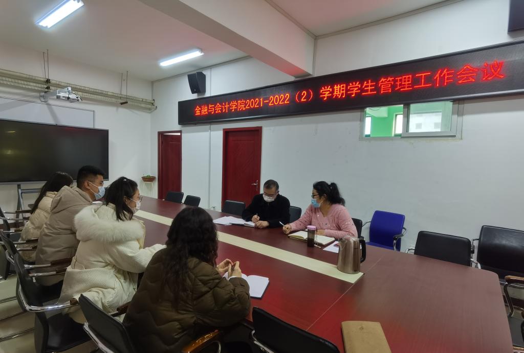 为进一步落实疫情防控工作要求,扎实做好新学期开学各项准备工作,2月18日下午,金融与会计学院新学期学生管理工作会议在SY5412会议室举行,院党总支书记吴宗奎、副书记胡晓慧、分团委会书记马峥和全体辅导员参加此次会议。