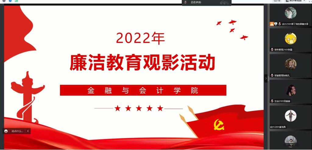 12月13日下午,金融与会计学院线上举办2022年廉洁教育讲座暨廉洁教育观影活动,学生金融会计支部学生党员、入党积极分子和学生代表参加活动,活动由党总支纪检委员马峥主持。