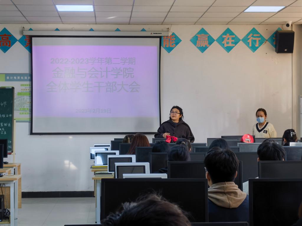 2月19日下午,金融与会计学院在SY8308实训室召开新学期学生干部会议。院党总支副书记胡晓慧、分团委书记马峥以及全体在校学生会、班干部参加了会议。