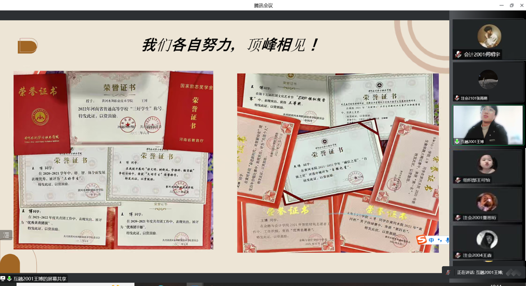 为传承自立自强的中华民族传统美德,弘扬拼搏进取的伟大时代精神,充分发挥榜样的思政引领作用,6月12日上午我院“自强之星”宣讲会以腾讯会议的方式在线上举行。担任此次宣讲的是刚被评为学校“自强之星”的互联网金融2001班王博和注会2101班张雨萌,我院2021级全体学生参加本次宣讲会,会议由我院2021级辅导员王歆然主持。