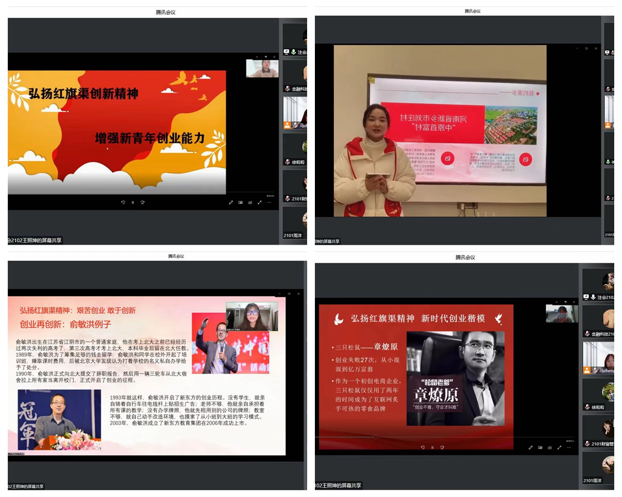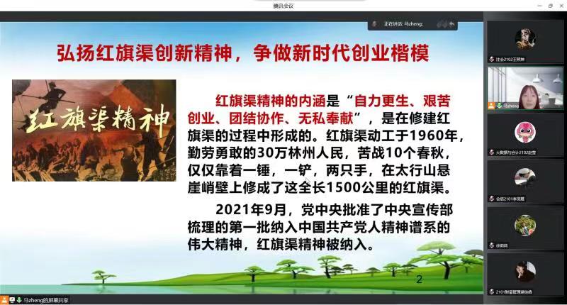 比赛伊始,院分团委书记马峥领学红旗渠精神,她指出,要紧跟习近平总书记到河南安阳林县红旗渠考察足迹,深入学习贯彻党的二十大精神,继承和发扬自力更生、艰苦创业、团结协作、无私奉献的红旗渠精神,脚踏实地、踔厉奋发,为建设中国特色社会主义现代化强国不懈奋斗。之后,依次播放21组选手的演讲视频,进行初赛评审。各组选手讲述的故事围绕红旗渠创业精神、知名企业家创业故事、高校大学生创新创业故事、学生个人创新创业实践经历等多角度选材,故事精彩纷呈,比赛如火如荼。最后,云会众创空间负责人徐莉莉老师做出点评的总结。