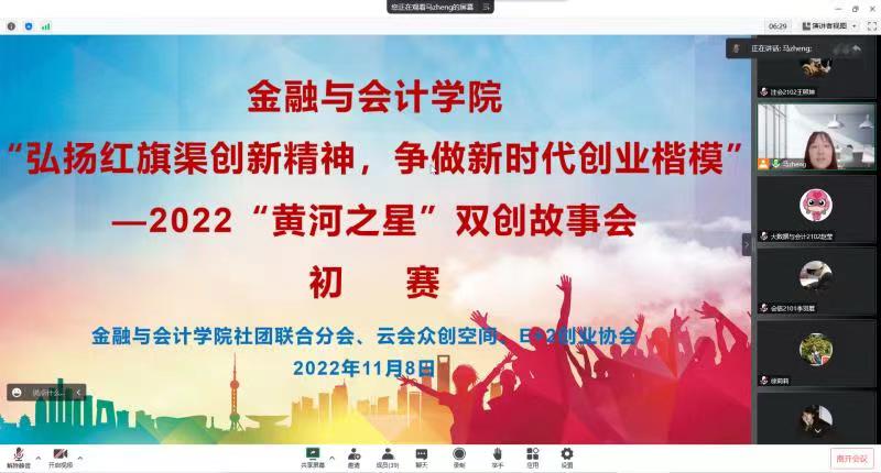 为学习宣传贯彻党的二十大精神,学习习近平总书记视察河南安阳林州红旗旗重要讲话精神,培养学生的创新创业意识,11月8日下午,金融与会计学院举行“弘扬红旗渠创新精神,争做新时代创业楷模”—2022“黄河之星”双创故事会初赛选拔。本次比赛由金融与会计学院社联分会、云会众创空间、E+2创业协会联合举办,2021、2022级共21组选手参加比赛。