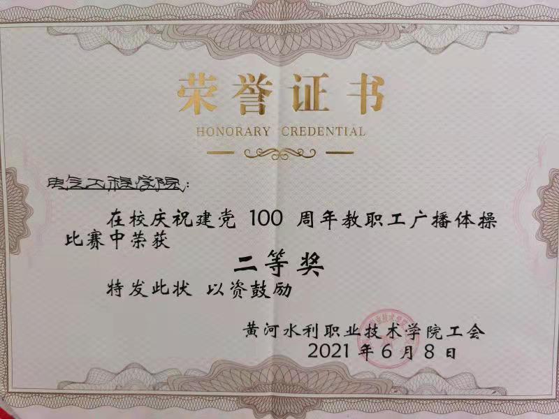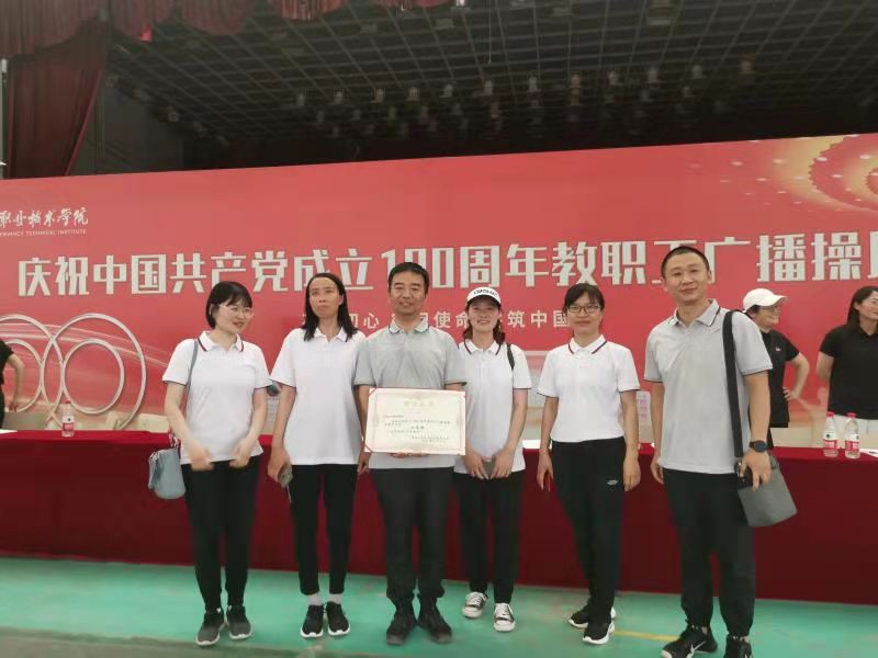 为了庆祝中国共产党成立100周年,丰富教职工校园文化生活,提高身体素质,推动教职工自觉锻炼、主动健身,2021年6月8日,由校工会举办的庆祝中国共产党成立100周年教职工广播操比赛在风雨球场如期开展,来自全校的18支教职工代表队参加了比赛,我院代表队获得团体二等奖的好成绩。