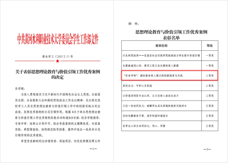 11月12日,学校思想理论教育与价值引领工作优秀案例征集活动结果揭晓,我院报送的《“百舍争鸣”:高校宿舍育人模式的创新探索与实践》案例凭借鲜明的特色、扎实的实践成效荣获二等奖。
