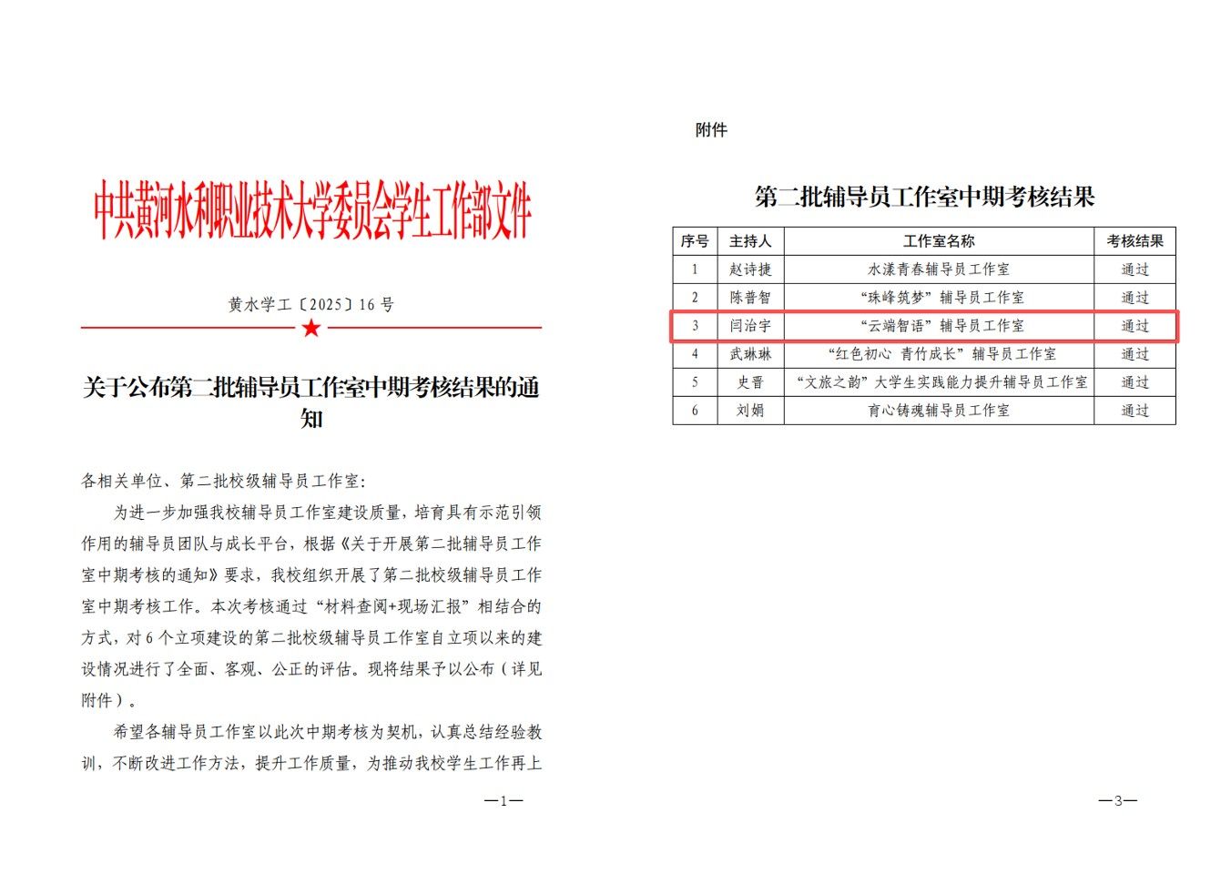 近日,根据学校发布的《关于公布第二批辅导员工作室中期考核结果的通知》(黄水学工〔2025〕16号),我院“云端智语”辅导员工作室顺利通过中期考核。这一成果标志着学院在辅导员队伍专业化、职业化建设方面迈出了坚实一步,为推动学生工作高质量发展注入新动能。