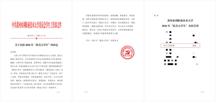 近日,365官网2026年“最美大学生”评选活动圆满落幕。电气工程学院电力2302班学生张磊凭借坚定的理想信念、优异的学业成绩和突出的综合表现,从众多候选人中脱颖而出,被授予“最美大学生”荣誉称号。