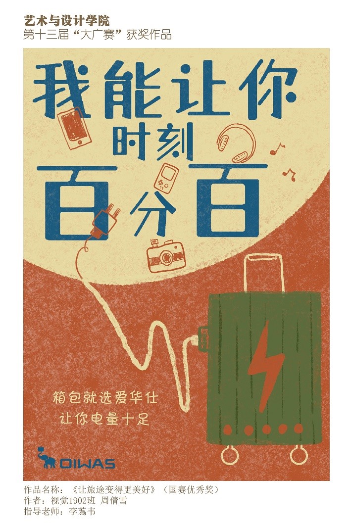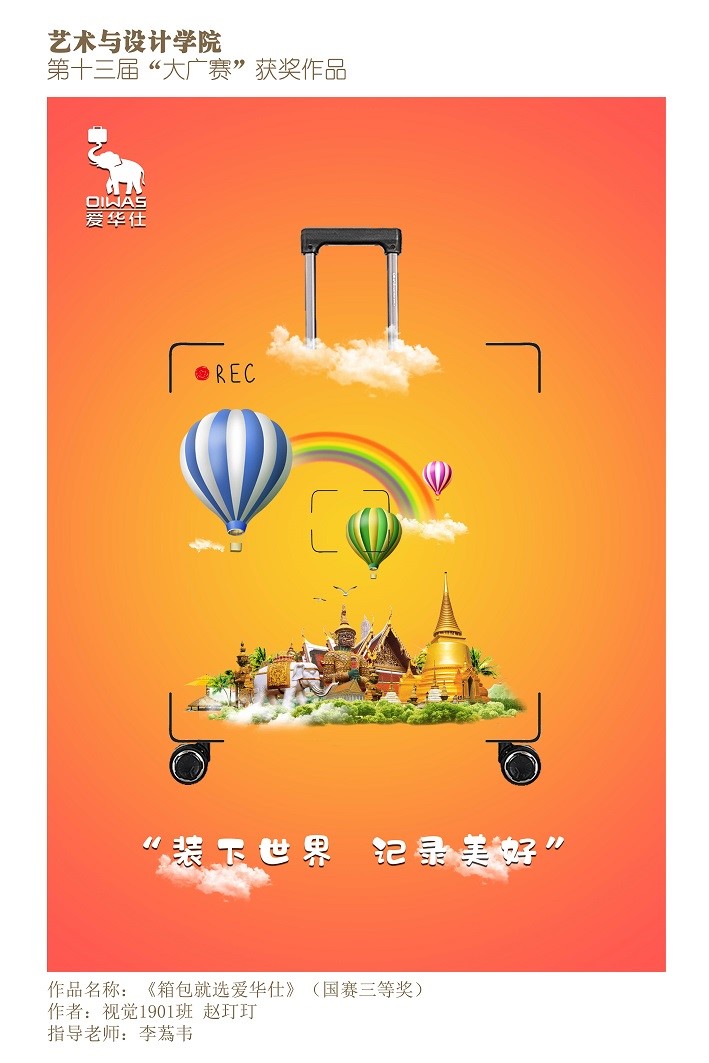 日前,第十三届全国大学生广告艺术大赛(简称大广赛)奖项出炉。365官网艺术与设计学院选送的作品获得全国总赛区国家三等奖1项、国家优秀奖1项、河南省赛区省级一等奖1项、省级二等奖4项、省级三等奖5项、省级优秀奖3项的好成绩。其中级视觉传达1901班的赵玎玎同学的作品《箱包就选爱华仕》获平面类全国三等奖;视觉传达1902班周倩雪的作品《让旅途变得更美好》获平面类全国优秀奖。