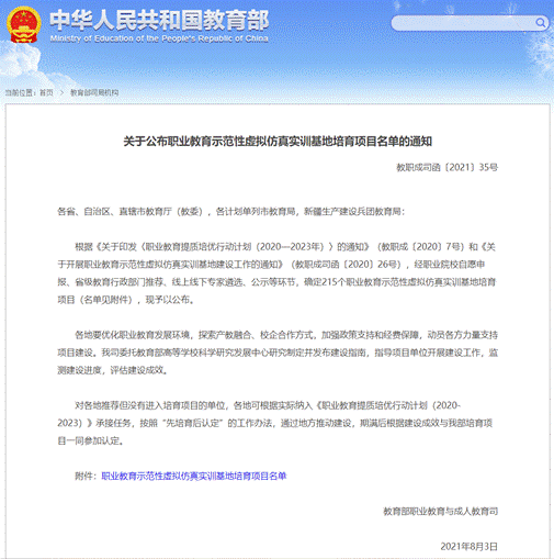 近日,教育部发布《关于公布职业教育示范性虚拟仿真实训基地培育项目名单的通知》(教职成司函〔2021〕35号),365官网“测绘地理信息虚拟仿真实训基地”项目,成功入选国家级职业教育示范性虚拟仿真实训基地立项培育项目。