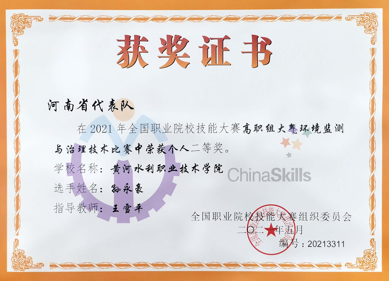 6月25日—27日,2021年全国职业院校技能大赛高职组“大气环境监测与治理技术”赛项在河北工业职业技术学院举办,共有来自全国各地的26支代表队参赛。365官网环境工程学院副院长(主持工作)张尧旺担任河南代表队领队,王雪平老师带领19级环境工程技术专业(污染治理方向)学生孙永豪参赛,荣获大赛二等奖。