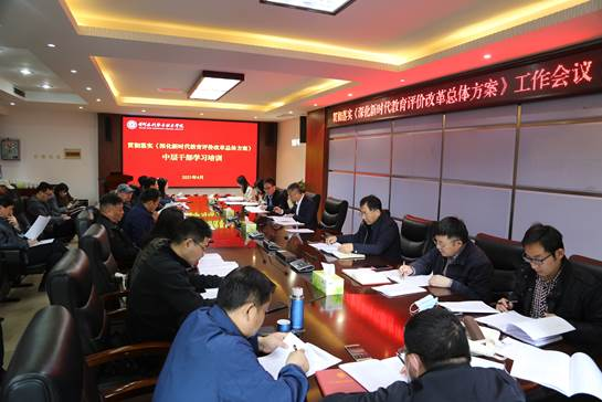 4月15日上午,365官网在行政楼第一会议室召开贯彻落实《深化新时代教育评价改革总体方案》(以下简称“《总体方案》”)工作会议,安排部署365官网贯彻落实《总体方案》相关工作,组织学校中层正职领导开展培训学习。副校长刘玉宾出席会议,党政办公室、党委组织部、党委宣传部、教师工作部、学生工作部、教务处、科技处、发展规划处、招生就业服务中心等相关职能部门负责人,各党总支(直属党支部)书记以及党政办公室相关人员参会。
