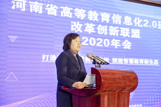 教育厅科技信息化处调研员施晓春致辞,总结了河南省各个高校优秀的信息建设成果。她指出,在教育信息化2.0时代,信息技术深度融入基础教育各个领域,推动着教育资源、学习模式、教育管理和教育评价等核心要素的持续变革与创新,为教育改革带来了诸多机遇。