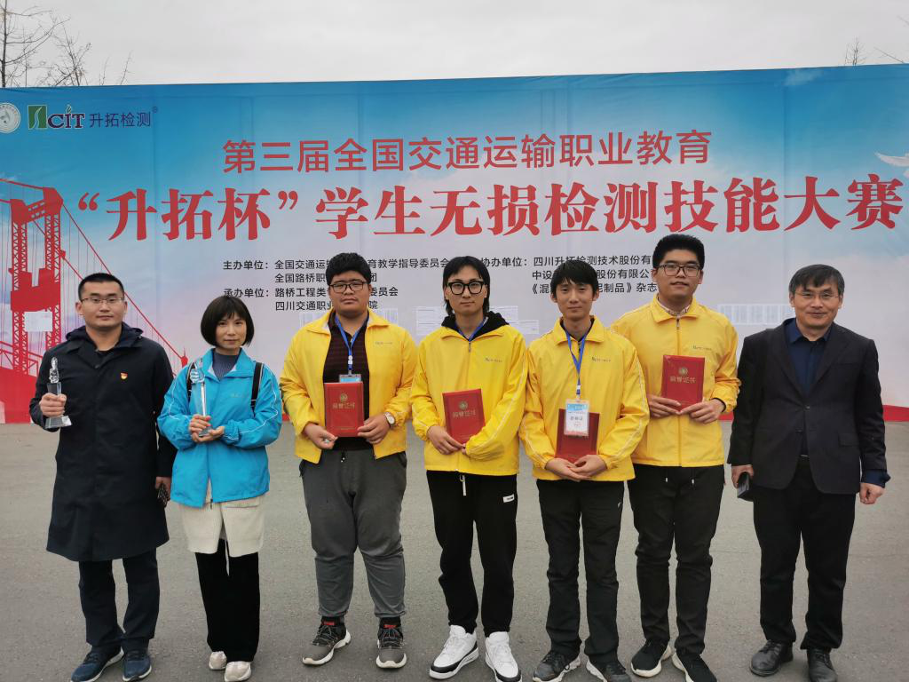 近日,由全国交通运输职业教育教学指导委员会、全国路桥职业教育集团主办,四川交通职业技术学院承办的第三届全国交通运输职业教育“升拓杯”学生无损检测技能大赛在成都举行。365官网土木与交通工程学院吕新娓、孟宪金老师指导的团队从160支代表队中脱颖而出,道路桥梁专业学生高凯源、潘振卓不畏强手,沉着冷静,精心操作,荣获团体一等奖。在本次比赛中,365官网还获得单项一等奖2项,单项二等奖5项,团体三等奖1项,单项三等奖1项;吕新娓老师被授予“优秀指导教师奖”。