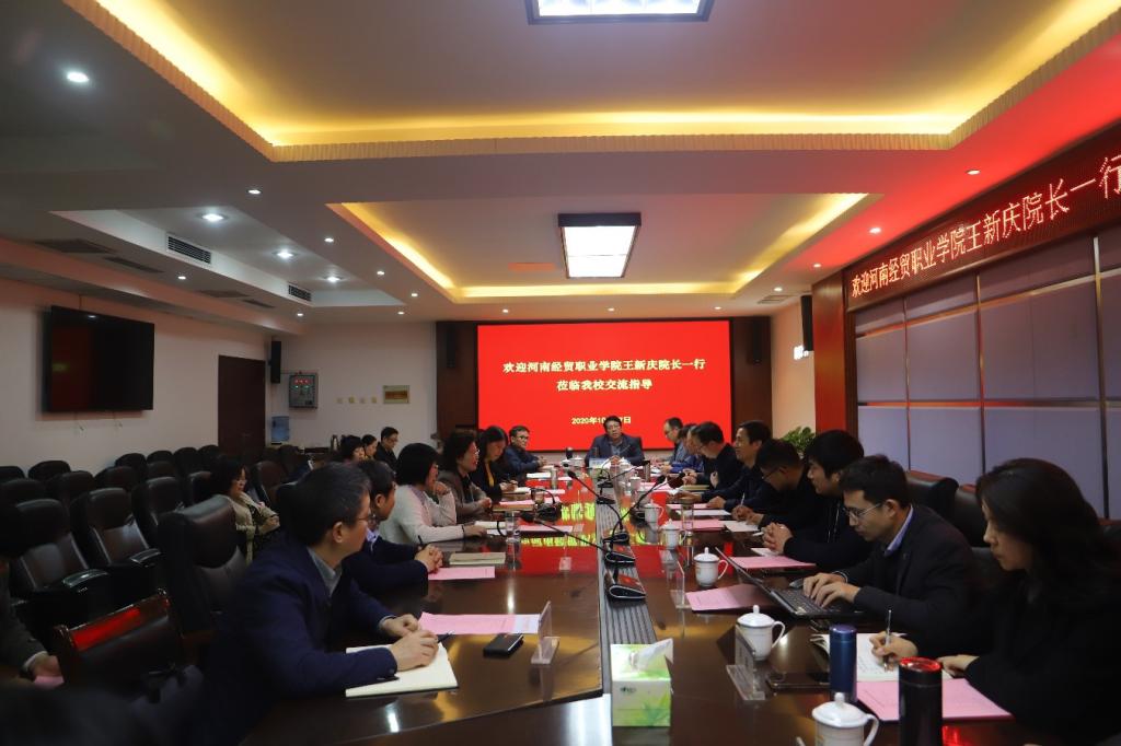 10月27日上午,河南经贸职业学院院长王新庆一行14人来365官网考察交流“双高校”建设和人才培养工作。365官网党委书记周保平、校长祝玉华、副校长焦爱萍热情接待了王新庆一行,党政办公室、学生工作部、教师工作部、教务处(质量管理办公室)、国有资产管理处、对外联络合作处、国际教育学院、信息工程学院、继续教育学院、发展规划处、信息化管理办公室、金融与会计学院等部门负责人与来访客人进行了座谈交流。