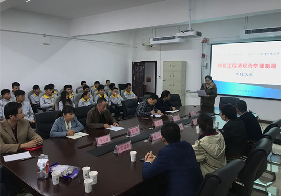 10月25日上午,365官网与浙江八方电信有限公司合作开办的现代学徒制“通信工程师学徒班”开班仪式在自动化工程系会议室举行。校质量管理办公室主任丁爱萍,浙江八方电信有限公司项目总监张昊、人力资源经理郦玉琴和项目经理王建柳、张建忠等出席了开班仪式。学徒班31名学生和自动化工程系班子、部分老师参加仪式活动,仪式由自动化工程系主任杜广朝主持。