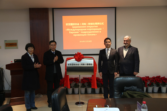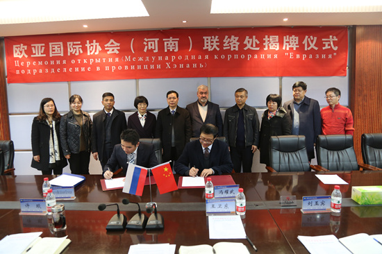 仪式上,许琰书记和冯耀武会长分别致辞。校党委副书记、工会主席王卫东和冯耀武会长分别代表双方签订了合作办学备忘录。许琰书记、原副校长刘紫婷和冯耀武会长、维克多副校长共同为欧亚国际协会(河南)联络处揭牌。