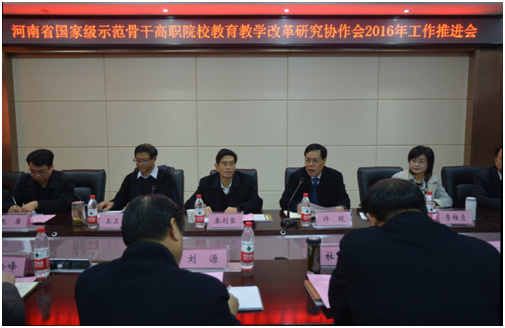 河南省教育厅高教处副处长秦剑臣讲话指出,此次河南省国家级示范骨干高职院校教育教学改革研究协作会工作推进会,也是示范骨干院校工作的交流会。协作会成立以来,以“交流、研讨、协作、共进”为宗旨,开展了多方面的交流与合作。在总结交流办学经验,凝炼教学改革特色,研究教学热点难点,推广改革经验,促进共同发展等方面起到很大的促进作用,充分发挥了示范骨干院校在我省高职教育中的示范引领作用。当前正值高等职业教育创新发展行动计划实施阶段,希望各院校结合创新发展行动计划、教学诊改、现代学徒制等重点工作,积极探索,主动承担,带领我省高职院校将各项工作落实到位,培育优势,突出特色,形成模式,不断提高办学水平和服务能力,推动我省的高职教育创新发展。