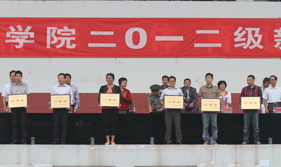 军训分列式结束后,学生处处长朱焕立宣布了军训总评获奖方队(系部)、十佳教官、优秀辅导员和学生助理名单。院领导和部队首长向获奖单位和个人颁发了奖牌和证书。