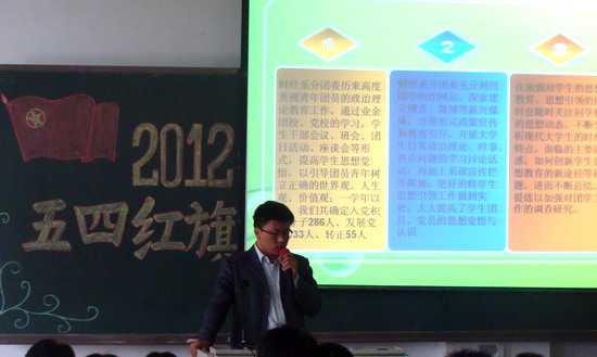 为进一步加强学院共青团组织的自身建设,充分调动全院各级团组织及共青团员的积极性,促进我院团的工作深入发展,4月27日下午,我院在6203教室举行beat365唯一官网2011-2012年度“五四红旗分团委”评选现场展示活动。院团委书记周志琦、副书记谷献晖和14个系分团委书记参加了会议。