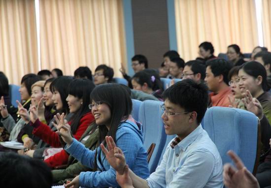 讲座中,殷亚敏先生不断运用诙谐幽默的语言和丰富生动的手势,调动着全场师生随着他进行“双人舞”的训练,现场掌声阵阵,笑声不断,使大家在轻松愉快的气氛中学会了讲话和发声的技巧。最后,殷亚敏先生和在场师生进行了互动交流,解答了部分师生关于演讲和表达的问题,分享了经验。讲座在广大师生中收到了良好的效果,一位学生兴奋的说:“殷老师的讲座给了我很大的启发,原来当众发言可以这么简单!我以后每天都要坚持说‘悄悄话’,早一点学会讲话的技巧!”