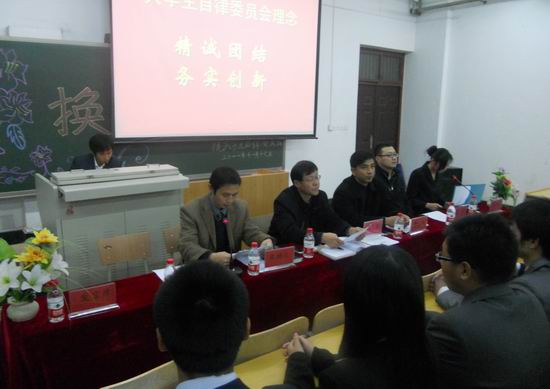 1117下午,2011级大学生自律会(楼委会)学生干部换届聘任大会在教学楼2103室召开。院党委副书记、纪委书记王卫东出席会议,学生处处长菅浩然、副处长朱焕立、宿管科科长兼大学生自律委员会秘书长柴杉、宿管科成继恩及学生干部代表共200余人参加了大会。