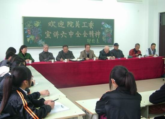 11月1日下午,应财经系邀请,我院关工委老干部在教学楼5402室宣讲了十七届六中全会精神,并与财经系学生代表进行了座谈。出席座谈会的有关工委老干部、财经系党总支书记张玉姣及各年级预备党员、入党积极分子等学生代表。