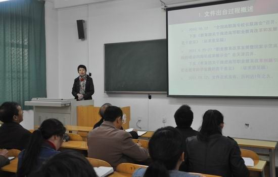 首先,支部书记焦爱萍对近期教育部出台的几个重要指导性文件的背景、主要内容等进行简介,并带领全体人员认真学习了《关于推进高等职业教育改革创新引领职业教育科学发展的若干意见文件》全文。焦爱萍结合文件深入分析了国家“十二五”规划纲要及《国家中长期教育改革和发展规划纲要(2010-2020年)》对职业教育提出的新的要求;阐述了职业教育面临的新形势和高职在建设现代职业教育体系中的地位、作用和新时期的新任务;并结合我院教育教学改革发展情况对今后工作提出意见和建议。