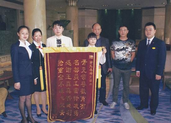 手包的主人先生是来汴进行商贸洽谈投资的湖北籍商人,失而复得的他心中充满了感动与感激,随即向酒店赠送了这面锦旗,以表达对酒店,尤其是对拾金不昧的我院学子管健利同学的感谢与表扬。锦旗之上,管健利同学被赞“拾金不昧心灵美”。上学期在中州国际饭店实习时,管健利同学就曾在客房拾到一块欧米茄名表,也毫不犹豫地通过努力找到并交给失主。管健利同学拾金不昧的行为,不仅为酒店,更是为黄河水院赢得了良好的美誉度,也为维护开封良好形象、优化投资环境做出了自己应有的贡献。