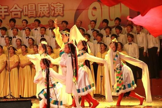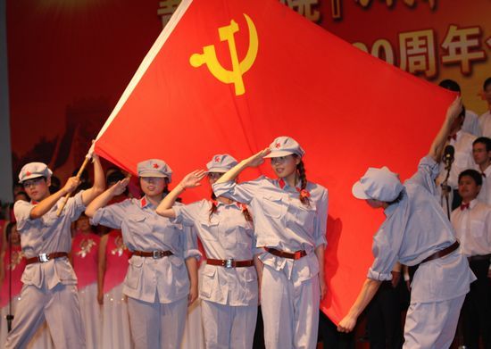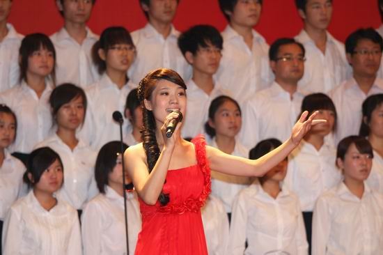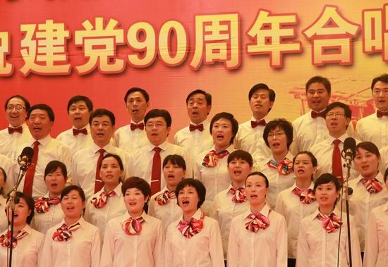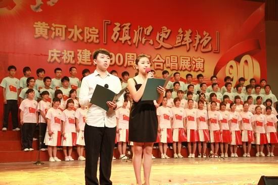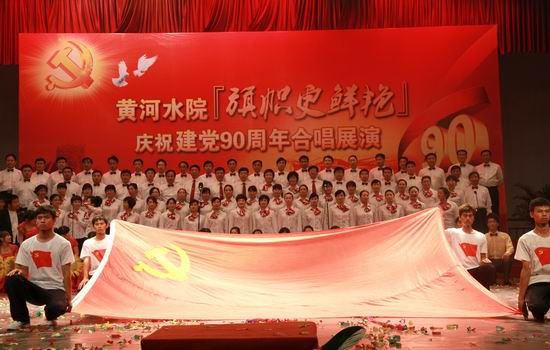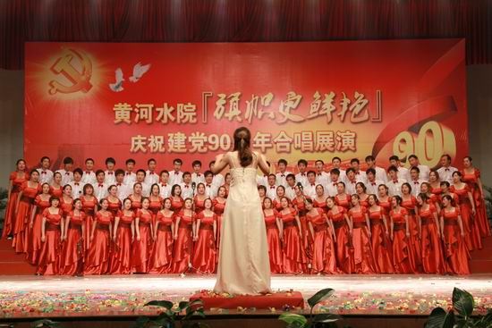 党旗飘扬、歌声嘹亮。在锣鼓喧天、激情澎湃的热烈气氛中,院党委书记张惠贞首先致辞。张书记指出,90年峥嵘岁月,伟大的中国共产党领导勤劳、勇敢、智慧的中国人民实现了民族独立、人民解放和国家富强、人民幸福。特别是改革开放的30年,更是取得了举世瞩目的辉煌成就,创造了一个个人间奇迹。伴随党的兴旺和祖国的发展,学院也走过了82年的发展历程。特别是步入新世纪的10年,沐浴着国家大力发展职业教育的春风,学院实现了大发展、大跨越:新校区拔地而起,人才培养水平评估获得优秀,国家示范性高职院校建设取得成功,学院顺利步入全国高等职业教育前列。学院的每一次发展、每一个进步、每一点成绩都来自于各级党组织的坚强有力,来自于全院师生员工的共同努力,来自于全体党员的无私奉献。红色经典歌曲是我党90年光辉历程的生动写照,我院师生以“旗帜更鲜艳”为主题,用红歌迎接党的90华诞,以赞曲讴歌伟大的祖国、伟大的党,既别开生面,也很有意义。要以此来营造喜庆、祥和、团结奋进的浓厚氛围,来聚集人气、凝聚人心、激发热情、提振精神,继承革命传统、发扬优良作风,为党的教育事业、为中华民族的伟大复兴贡献智慧和力量,为黄河水院谱写更加辉煌的篇章。