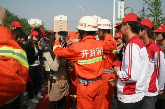 随后,在开封市地震局和市消防支队有关专家的指引下,进行了地震发生时的消防演练。志愿者们认识学习了有关地震救援消防器械的使用,亲身体验了烟尘防护面具、多功能担架等消防器材的使用。专家还向志愿者们讲解了有关医疗救助的基本知识和地震引发的心理危机干预知识、开封地区地震等级分布区域情况。
