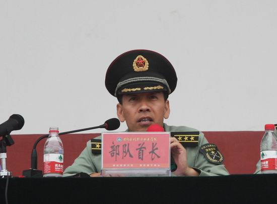 驻汴某部政委在大会上讲话。他首先充分肯定了同学们十天军训所取得的优异成绩,指出军训有助于同学们培养良好的组织性、纪律性,形成钢铁一般的意志。他希望同学们一定要把军训中学到的好思想、好传统、好作风自觉地融入到大学生活中,不断发扬光大,以良好的心态接受人生道路中一次次严峻的考验,真正成长为有用的栋梁之材。