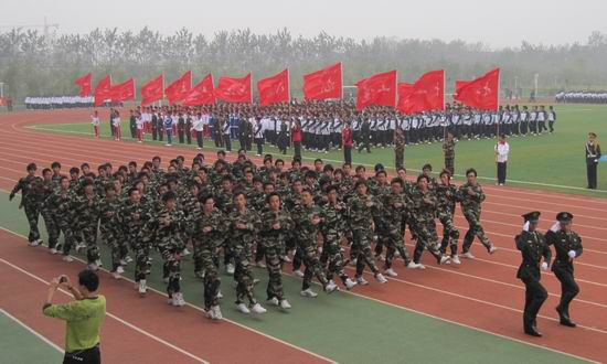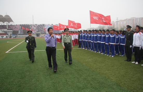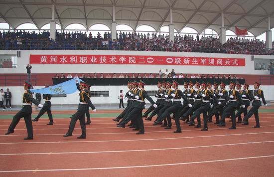 上午8点半,阅兵式在庄严的国歌声中拉开序幕。黄河水院党委书记、院长刘宪亮在潘永安大校的陪同下绕场一周,检阅了2010级新生军训方队。听到刘院长亲切的问候,同学们精神抖擞,以响亮的声音向领导问好。