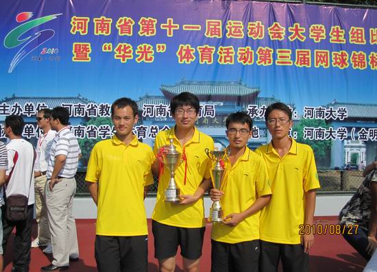 8月27日,河南省第十一届运动会大学生组比赛暨“华光”体育运动河南省第三届大学生网球锦标赛在河南大学落下帷幕。全省的28所高校派队参赛,是我省迄今为止参赛规模最大的一届网球赛事。我院派出了以体育部副主任刘盎为领队,4名男队员组成的代表队参赛。经过5天紧张、激烈的比赛,我院网球健儿发挥特别能吃苦、特别能战斗的拼搏精神,在教练员精心技战术布置下,一举获得了专科甲组团体总分第二名、专科甲组男子团体第二名两座奖杯。个人项目上,水利系万安舸获得单打第三名,财经系孙梓刚、代皖分获第四名和第六名,交通系赵成获第八名;万安舸和代皖配对获双打第二名,赵成和孙梓刚配对获双打第四名的好成绩。