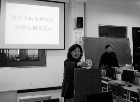 地震无情,人间有爱。4月19日,财经系在实训楼8414室举行党员干部与教职工向玉树灾区献爱心捐款活动。系党总支书记张玉姣、系主任张辉、副书记宋建涛、副主任梁建民及系教师参加了活动。