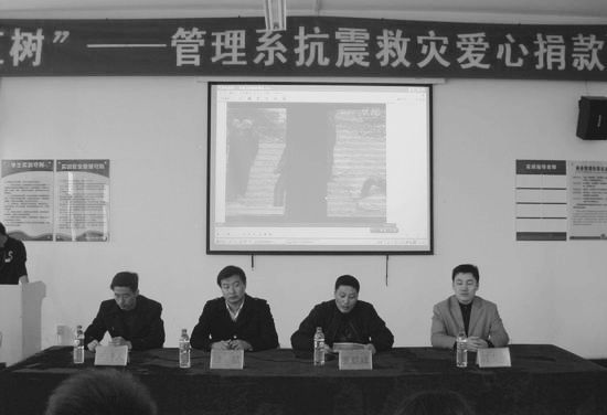 4月20日,管理系党总支积极响应院党委的号召,发动全系师生踊跃向地震灾区捐款献爱心。该系很多同学自发地以班级为单位,将他们的爱心捐款投进了募捐箱。春潮涌动,爱心成河,在场的每一位师生都为奉献爱心而感到暖意融融。截至发稿时,全系已捐款8800余元。