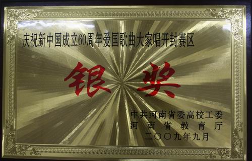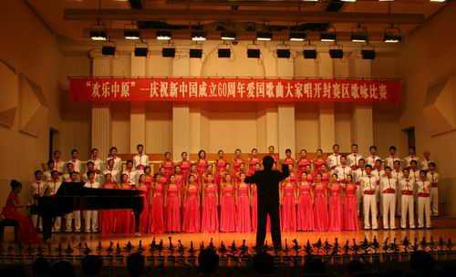 歌声嘹亮,激情飞扬。9月2日上午,由河南省高校工委、省教育厅主办,河南大学承办的“欢乐中原”庆祝中华人民共和国成立60周年爱国歌曲大家唱开封赛区比赛在河南大学音乐厅举行,我院学生合唱团以出色的表演获得银奖。