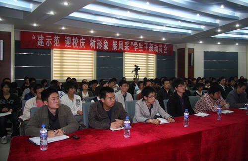 动员会上,王书记从示范性院校项目建设、学院的发展历程、当前学院的发展形势和面临的任务等方面,向同学们进行了深入细致的讲解。王书记动员广大学生干部要以身作则、勤奋学习、努力工作,带动广大同学努力提高素质,共同创建安全文明、和谐向上的校园环境,以主人翁精神和饱满的热情迎接示范性建设验收和学院八十周年校庆的到来。