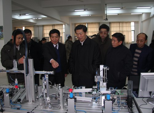 在现代制造技术实训基地,鄂部长一行参观了机电工程系模具制造实训室、普通机械加工实训室、数控技术实训室,听取了实训室有关同志的讲解汇报,对实训场馆建设表示满意。之后,鄂部长来到自动化工程系成套电气控制柜总装车间、供配电技术实训室、PLC实训室等进行了参观,听取了有关同志的讲解,并现场观看了MPS实训操作。
