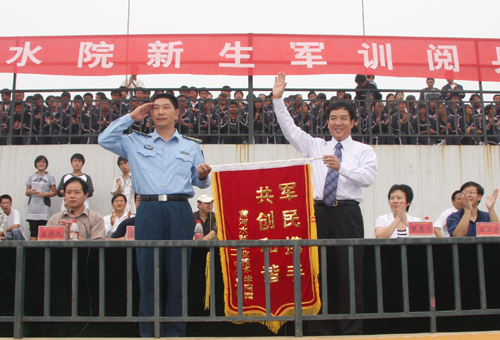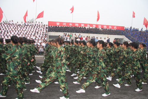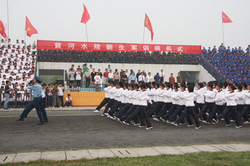 9月22日上午8点半,我院08级新生军训阅兵式在体育场隆重举行,4000多名受训新生迈着坚定整齐的步伐接受了检阅。我院领导刘宪亮、张惠贞、茹正波、王卫东,驻汴某部团长出席了阅兵式。大会由党政办主任杨士恒主持。