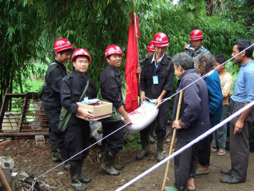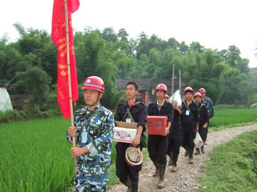 到达张兴明家中时,看到我们再次登门全家首先是诧异,紧接着上前迎接,老两口看到队员抬着整袋大米激动的说不出话来,张兴明这个老实憨厚的四川汉子此时变得不知所措。我们能从他们全家人的眼神中看出,他们此时此刻激动的心情难以言表。交谈时,我们积极鼓励张兴明一家克服困难,重建家园,恢复生产,努力生活。鼓励他的儿子张磊努力学习,掌握科学文化知识,不久的将来为家庭带来幸福和希望,懂事的张磊眼中含着泪使劲的点头。我们都清楚这不仅仅是承诺,更是对家庭获得幸福,对重建家园恢复生产的信心和勇气。最后队员们和张兴明全家合影留念。